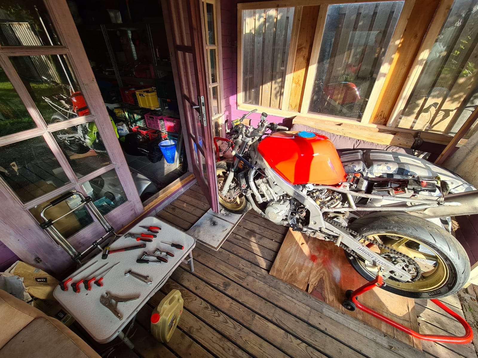 De weg van herstel was lang. Gelijk na de crash is de motor bij Motor Service Teunissen geweest voor een technische check-up. De check leverde goed nieuws op, gelukkig was alles nog recht! Nu kon de wederopbouw dan ook echt beginnen. Het heeft niet lang geduurd voordat er een donor motor was gevonden, voor onderdelen als afgebroken voetsteunen, afgeschuurde motorblokdeksels en gebroken clipons. Terwijl de afgebroken delen vervangen werden en in de donor nog een zo goed als nieuw K&N luchtfilter werd gevonden, waren er nogmeer onderdelen onderweg. Via Fullgas.nl was er een nieuwe kuip onderweg, terwijl LeanAngle.nl onder andere nieuwe tankgrips, een remhendel protector en borgbouten op de post had zitten.